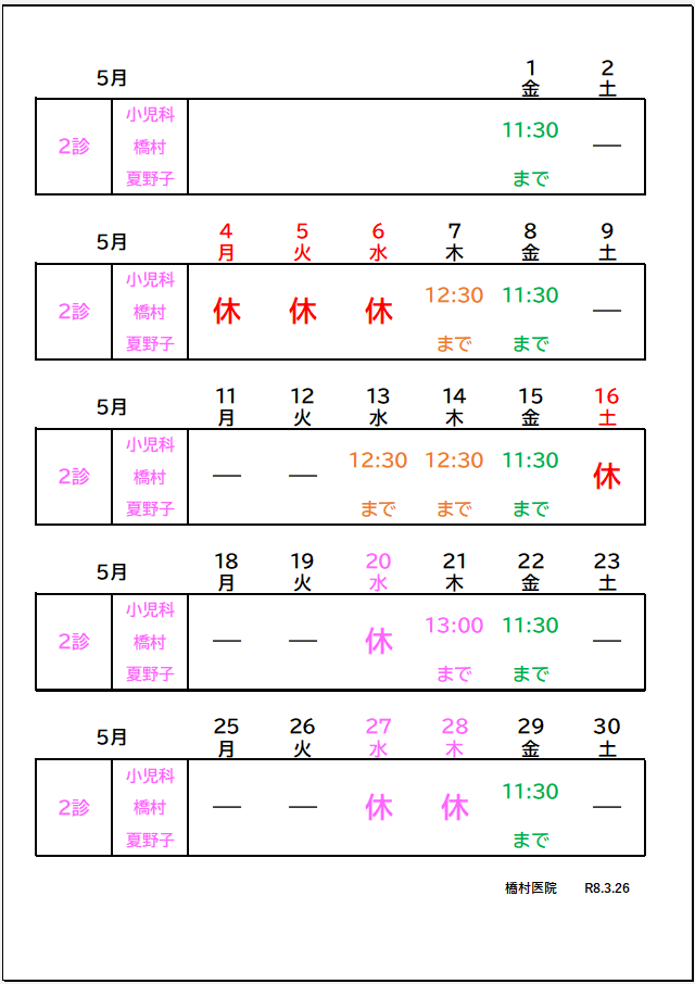 令和8年5月 診療時間